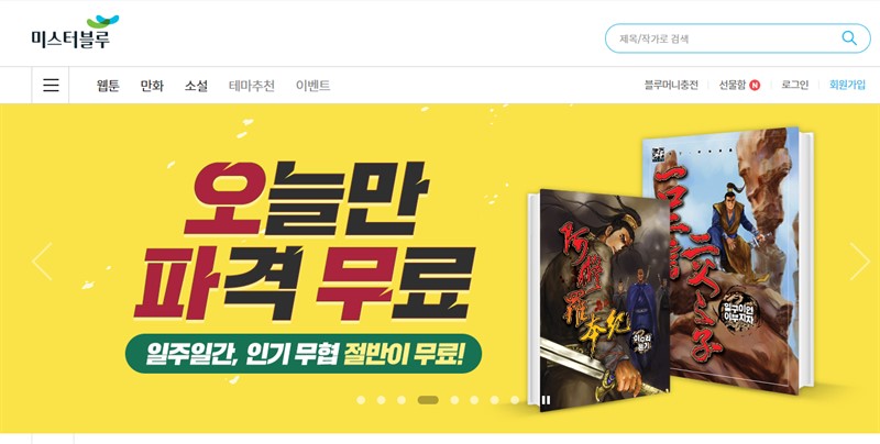 미스터블루 사이트 또한 일부 회차까지는 무료로 만화를 볼 수 있도록 제공해주는 곳이다. 완결권을 모두 구매하면 일부 할인되는 서비스들도 있고, 만화, 소설까지 무료제공 되고 있기 때문에 평소 만화를 즐겨보는 매니아들이라면 빼놓을수 없는곳이다.