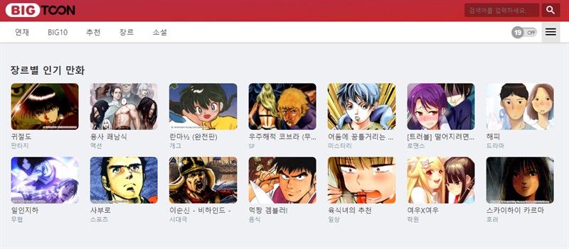 빅툰은 부분유료화 서비스를 제공하고 있는 일부 무료 만화 서비스 사이트이다. 다소 만화가 많이 존재하지 않지만, 추천순위부터 장르별까지 골고로 만화가 분포되어 있고, 편리하게 만화를 볼 수 있는게 장점이다.
