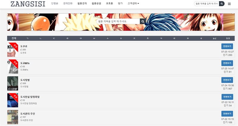 더욱 놀라운 점은 예전모습 그대로의 만화 통모음 사이트인 장시시 모습 그대로 였다. 상단 메뉴에 단행본, 연재만화, 웹툰연재, 웹툰완결 등이 모두 보이게 되는데, 일반적으로 단행본이나 연재 만화를 많이들 보게 된다.