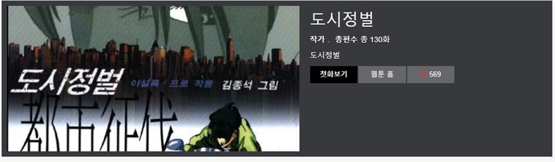 도시정벌 이라는 만화를 선택했는데, 그림이나 첫회 보기, 웹툰 홈부터 그리고 좋아요 표시까지 깔끔하게 나타나는걸 확인할 수 있었다.
