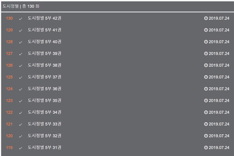 도시정별은 총 130화 까지 나와 있는것 같은데, 한 번에 업데이트를 여러번 한 것으로 보인다. 7월 24일에 일괄적으로 만화를 모두 업로드 진행하였다.