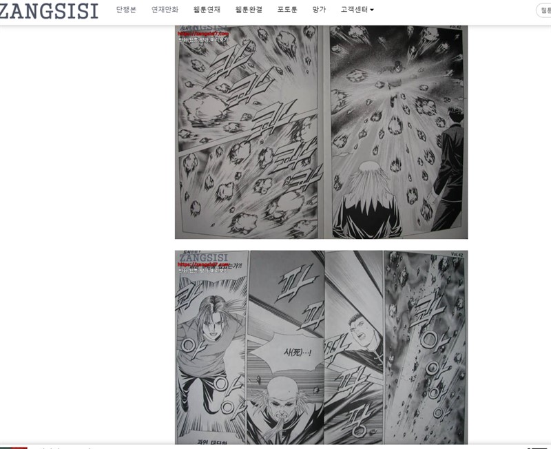아무거나 만화 하나를 선택해서 들어가게 되면, 실제 만화책에 있는것을 pdf 나 jpg 등 문서, 그림 파일로 저장해놓았는지 스캔 뜬모습처럼 보인다. 만화 왼쪽 상단에는 장시시 로고가 보임으로써 확실히 장시시 사이트이다.