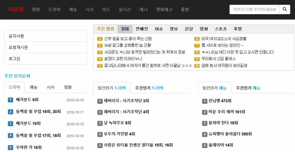 TV 다시보기 | 2019년 10월 21일 14시 47분다프리(dafree)라는 사이트는 무료로 각종 티비프로그램, 예능tv, 영화tv, 다큐멘터리 프로그램을 자유롭게 무료로 시청할 수 있는 다시보기 사이트중 하나이다. 사이트 주소가 j19.hitjjal.com 으로 사용되는걸 확인하였으나 최근들어서 사이트 접속이 원활하지 못하고 계속 끊어지는 현상을 발견하였다.