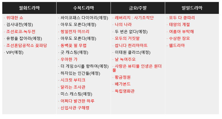 일일드라마로는 모두 다 쿵따리, 태양의 계절, 여름아 부탁해, 수상한 장모, 웹드라마 순이다.