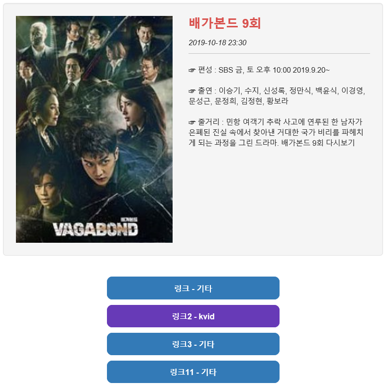 배가본드 9회를 한 번 다시보기 해보게 되었는데, 선택해서 들어가게 되면, 링크 순으로 여러 사이트에서 tv다시보기 드라마를 시청할 수 있다.