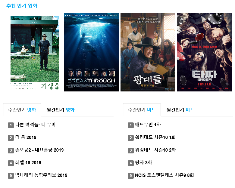 실제 접속 경로로 접속을 하게 되면 주간 인기 순위와 일간 인기 드라마, 주간 인기 드라마, 일간 인기 예능, 주간 인기 예능이 핫이슈이기 때문에 가장 먼저 눈에 들어올 수 밖에 없다.