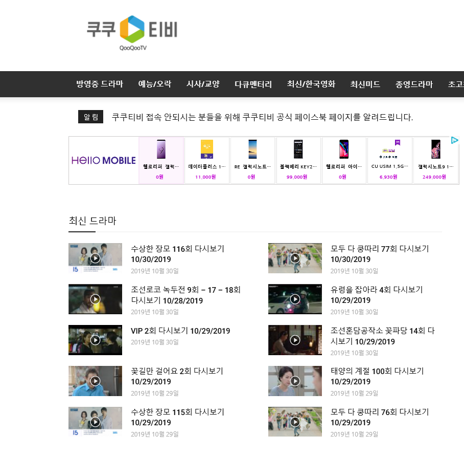 다시보기 사이트 순위 | 2019년 10월 30일 17시 20분무료 영화 드라마, 예능프로그램, 무료 티비 시청 재방송까지 모두 가능한 사이트인 쿠쿠티비(qooqootv)는 베이코리언즈 대체사이트로써도 큰 인기를 얻은 사이트이다.