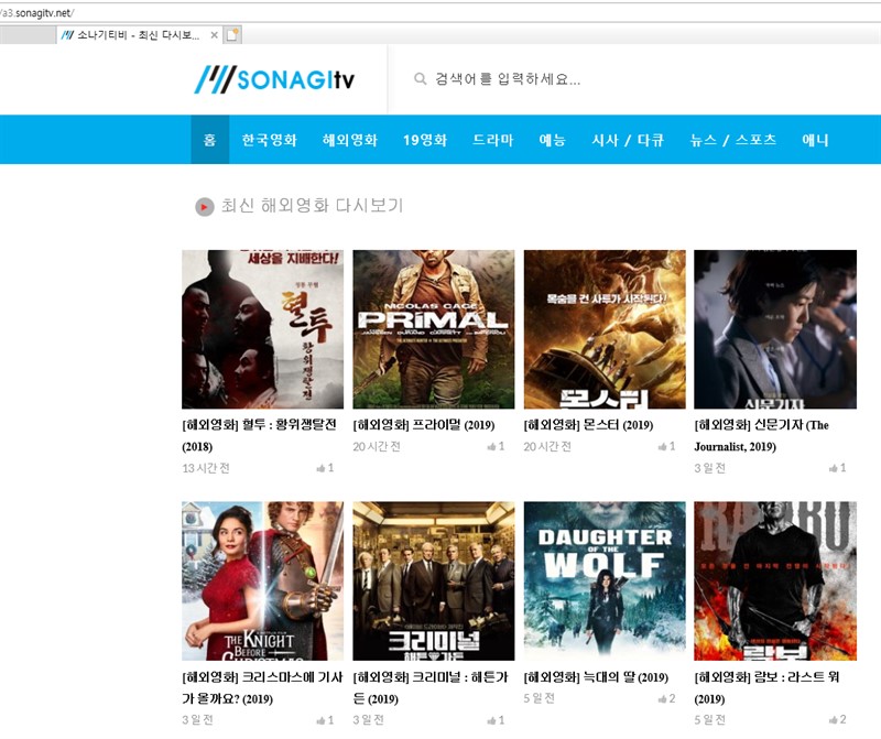 현재 다시봄티비 사이트는 소나기티비라는 사이트로 주소 변경이 된 상태이다. 상단 메뉴에 한국영화, 해외영화, 19영화, 드라마, 예능, 시사/다큐, 뉴스/스포츠, 애니메이션을 시청할 수 있도록 카테고리 정렬이 잘 되어 있다.