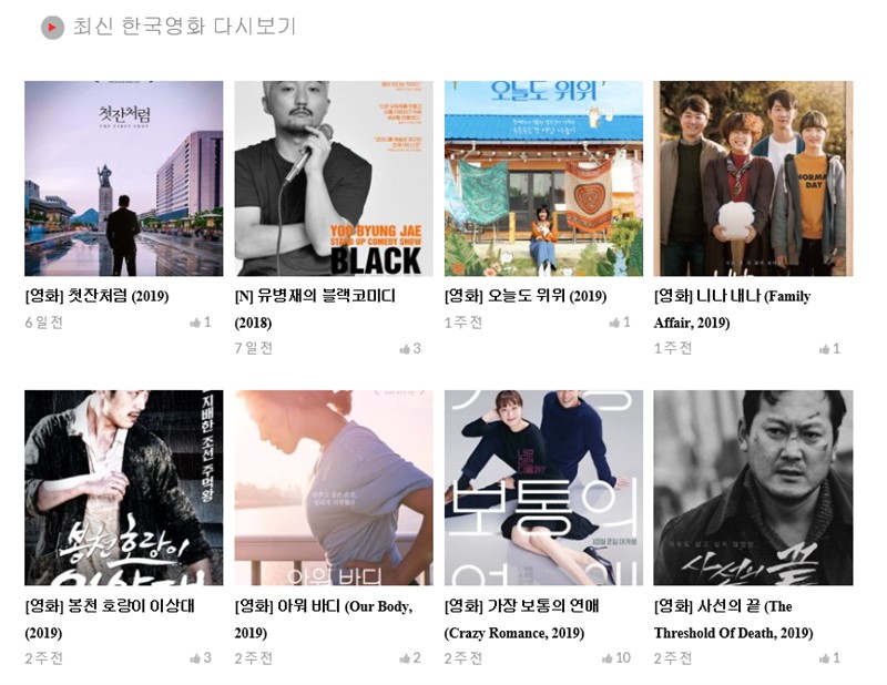 최신 한국영화 다시보기도 가능한데, 첫잔처럼, 유병재의 블랙코미디, 오늘도 위위, 니나 내나, 봉천 호랑이 이상대, 아워 바디, 가장 보통의 연애등이 있는걸 확인할 수 있었다.