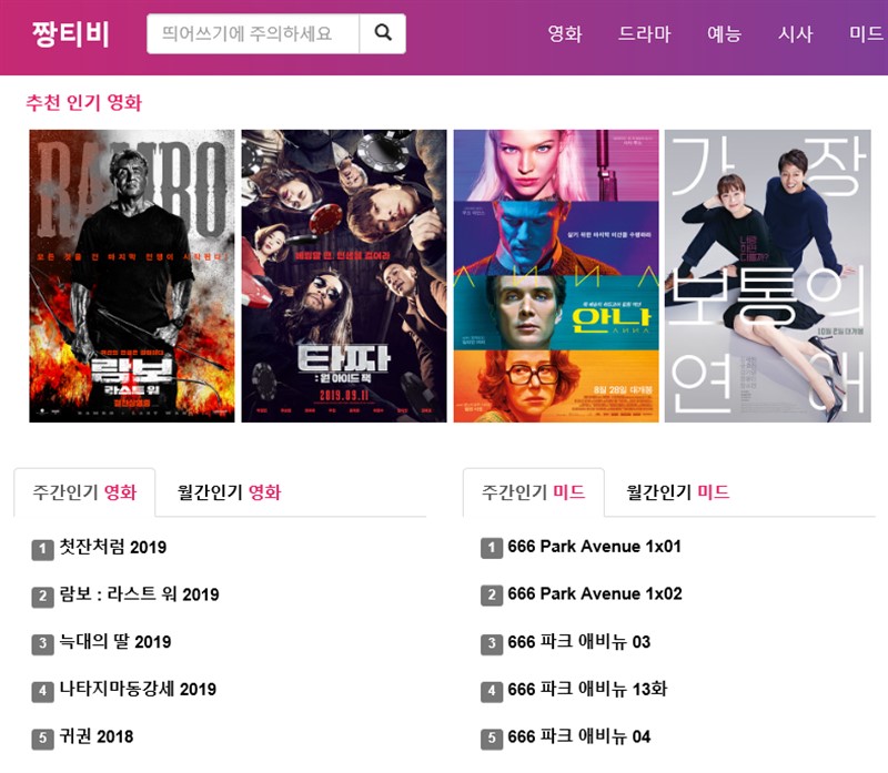 짱티비도 마찬가지로 무료tv다시보기 사이트이다. 링크바다와 유사한 디자인을 가지고 있는 사이트인데, 어차피 비슷비슷한 사이트들이 많기 때문에 그중에서 가장 망하지 않고, 폐쇠되지 않는 사이트를 선택하는것이 좋을것 같아 올려봤다.