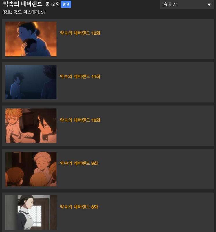 현재 약속의 네버랜드 12화까지 출시된 상태이다. 선택해서 영상시청을 하면 된다.
