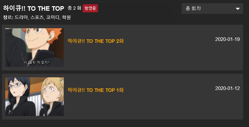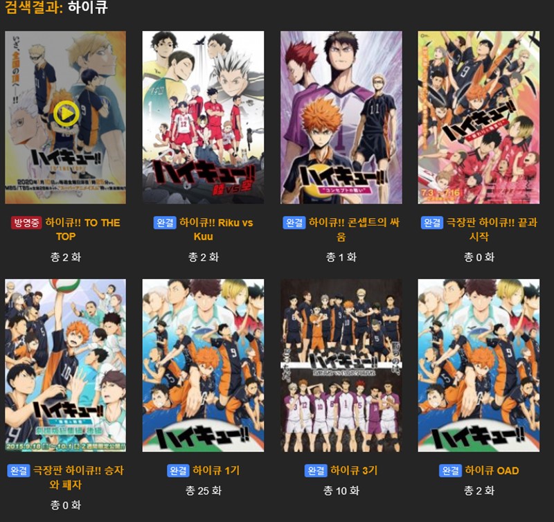 최근 방송된 하이큐와 함께 극장판 하이큐, 하이큐1기 하이큐2기 하이큐3기 하이큐 OAD까지 모두 시청 된다.