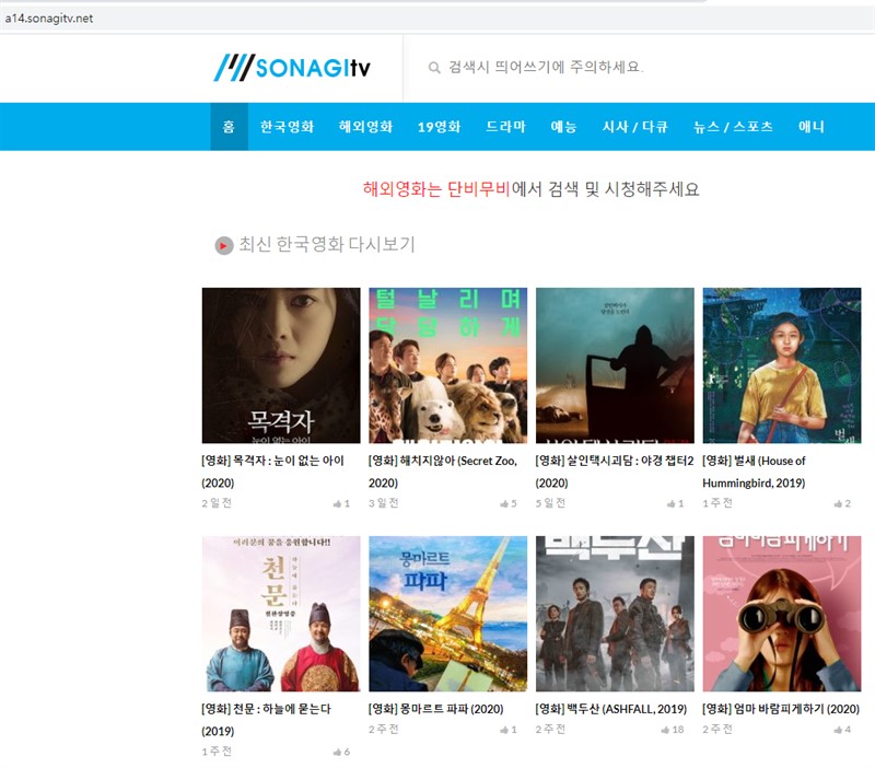 처음 소나기티비 사이트에 접속하게 되면, 최신 한국영화 다시보기 카테고리가 나타난다. 최근 업로드 된 자료를 확인해보면 영화 목격자 눈이 없는 아이, 영화 헤치지 않아, 영화 살인택시괴담, 영화 별새, 영화 천문 하늘에 묻는다, 영화 몽마르트 파파, 영화 백두산, 영화 엄마 바람피게하기 등이 업로드 되어 있다.