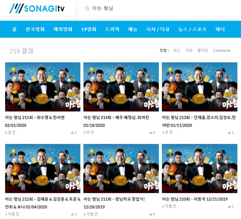 우선 아는 형님을 재방송으로 시청하고 싶어서 상단 메뉴에 아는형님을 검색했다. 최근 2020년 2월1일에 자료가 업로드 되어 있는걸 확인할 수 있었다.