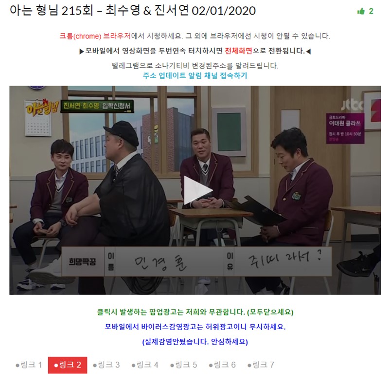 실제로 아는형님을 시청해봤더니 화질이 생각보다 좋았다. 높은 퀄리티의 화질을 자랑했으며, 영상이 끊김 없이 재생가능했다. 혹시나 영상이 제대로 나타나지 않는다면, 링크1에서부터 링크7까지를 선택해서 보면 된다.