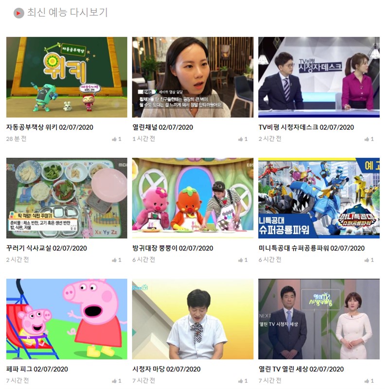 최신 예능 다시보기를 확인하게 되면, 자동공부책상 위키, 열린채널, TV비평 시청자데스크, 꾸러기 식사교실, 방귀대장 뿅뿅이, 미니특공대 슈퍼공룡파워, 페파 피그, 시청자 마당, 열린 TV열린 세상이다.