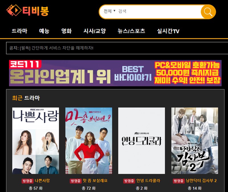티비봉 사이트 테마는 다소 음침하고, 우두운 배경을 보여주고 있다. 왜 이런 배경을 사용했는지는 모르겠지만 다소 긍정적인 이미지를 보여주지는 못하다.